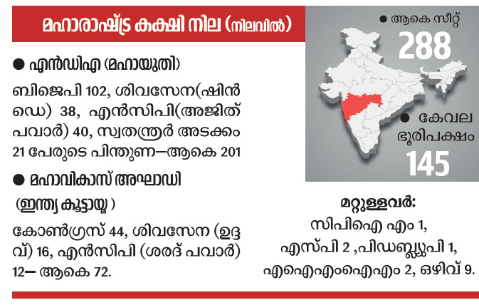 മന്ത്രിസഭയിലും മുന്നണിയിലും തമ്മിലടി രൂക്ഷമായതോടെ ബിജെപി സഖ്യം പ്രതിസന്ധിയിലാണ്. ശിവസേന പിളർത്തി എത്തിയ ഏക്നാഥ് ഷിൻഡയെ മുഖ്യമന്ത്രിയും എൻസിപി പിളർത്തിയ അജിത് പവാറിനെ ഉപമുഖ്യമന്ത്രിയും ആക്കിയെങ്കിലും ലോക്സഭയിൽ തിരിച്ചടിയേറ്റു. ബിജെപി ഒറ്റയക്കത്തിലൊടുങ്ങി. അജിത് പവാറിനെ കൂടെക്കൂട്ടിയതിൽ ബിജെപി പ്രവർത്തകർ അമർഷത്തിലാണ്. മാറാത്ത സംവരണ പ്രക്ഷോഭവും കർഷകരോഷവും എൻഡിഎയെ അലട്ടുന്നു. തിങ്കളാഴ്ചത്തെ മന്ത്രിസഭ യോഗം ഉപമുഖ്യമന്ത്രി അജിത് പവാർ ബഷിഷ്ക്കരിച്ചു.ബിജെപി ദേശീയ പ്രസിഡന്റ് ജെപി നദ്ദയും ആഭ്യന്തരമന്ത്രി അമിത് ഷായും സംസ്ഥാന നേതാക്കളെ ആശങ്ക അറിയിച്ചിട്ടുണ്ട്. അജിത് പവാർ പക്ഷത്തെ പ്രമുഖ നേതാവും മുൻമന്ത്രിയുമായ ബാബ സിദ്ദിഖി കൊല്ലപ്പെട്ടത് സംസ്ഥാനത്തെ ക്രമസമാധാനനിലയെ കുറിച്ച് ഗൗരവമായ ആശങ്ക ഉയര്ത്തുന്ന ഘട്ടത്തിലാണ് മഹാരാഷ്ട്ര തെരഞ്ഞെടുപ്പിലേക്ക് നീങ്ങുന്നത്.