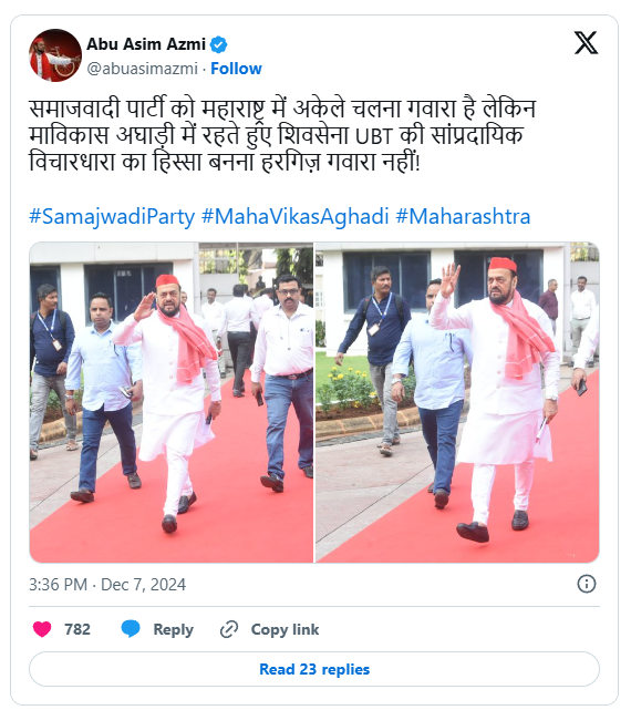 പാർട്ടി ഒറ്റയ്ക്ക് നിന്നോളാം, പക്ഷെ ഒരിക്കലും വിഭാഗീയതയുടെ രാഷ്ട്രീയത്തിന് ഒപ്പം നിലനില്ക്കാന് കഴിയില്ല. എംവിഎ അംഗങ്ങളും ഇങ്ങനെ വിഭാഗീയത സംസാരിക്കയാണെങ്കിൽ ബിജെപിയുമായി അവർക്ക് എന്ത് വ്യത്യാസമാണുള്ളത്. അതിനാല് മഹാ വികാസ് അഘാഡിയിൽ നിന്ന് ഞങ്ങള് സ്വയം പിന്മാറുകയാണെന്നും ആസ്മി എക്സില് പങ്കുവെച്ച പോസ്റ്റില് വ്യക്തമാക്കി.