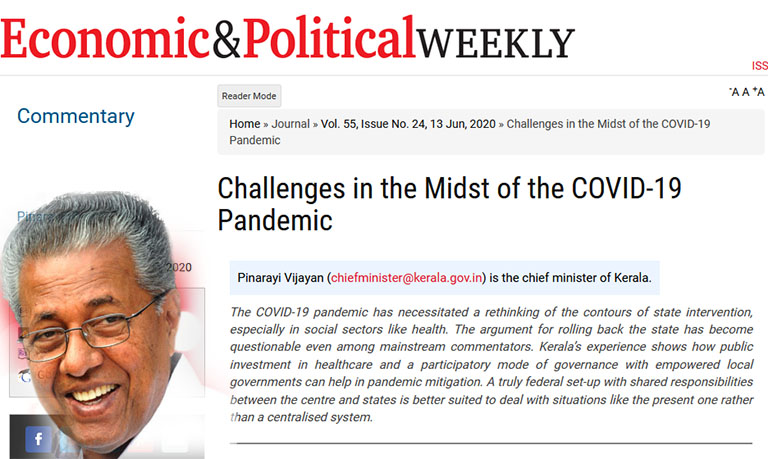 ഇക്കണോമിക് ആൻഡ് പൊളിറ്റിക്കൽ വീക്ക്‌ലിയുടെ ജൂൺ 13 ലക്കം ശ്രദ്ധേയമാകുന്നത് മുഖ്യമന്ത്രി പിണറായി വിജയന്റെ ഒരു ലേഖനത്തിലൂടെയാണ് (ലക്കം 55, ജൂൺ 13, 2020) . “കോവിഡ് മഹാമാരിയുടെ മധ്യേയുള്ള വെല്ലുവിളികൾ’ എന്ന ഈ ലേഖനത്തിൽ കോവിഡ് –-19 നെതിരായ സംസ്ഥാനത്തിന്റെ പ്രതിരോധ പ്രവർത്തനങ്ങൾ ആധികാരികമായി അദ്ദേഹം വ്യക്തമാക്കുന്നു. പകർച്ചവ്യാധികളും പ്രകൃതി ദുരന്തങ്ങളും നേരിടുന്നതിൽ വികേന്ദ്രീകൃതവും ജനകീയവുമായ പ്രവർത്തനങ്ങളുടെ പ്രാധാന്യവും വിവരിക്കുന്നുണ്ട്. അമേരിക്ക, ബ്രസീൽ, റഷ്യ തുടങ്ങിയ രാജ്യങ്ങളിലും  മഹാരാഷ്ട്ര, തമിഴ്നാട്, ഡൽഹി പോലുള്ള സംസ്ഥാനങ്ങളിലും രോഗം നിയന്ത്രണാതീതമായി തുടരുന്നു. അന്യസംസ്ഥാനങ്ങളിൽനിന്നും വിദേശരാജ്യങ്ങളിൽനിന്നും ലക്ഷക്കണക്കിനാളുകൾ തിരികെ എത്തിത്തുടങ്ങിയതോടെയാണ് സംസ്ഥാനത്തെ രോഗികളുടെ എണ്ണവും മരണനിരക്കും ഇത്രയുമുയർന്നത്. ഈ സാഹചര്യത്തിൽ കേരളത്തിന്റെ രോഗപ്രതിരോധം മറ്റു സംസ്ഥാനങ്ങൾക്കും രാജ്യങ്ങൾക്കും മാതൃകയാക്കാവുന്നതാണ്.