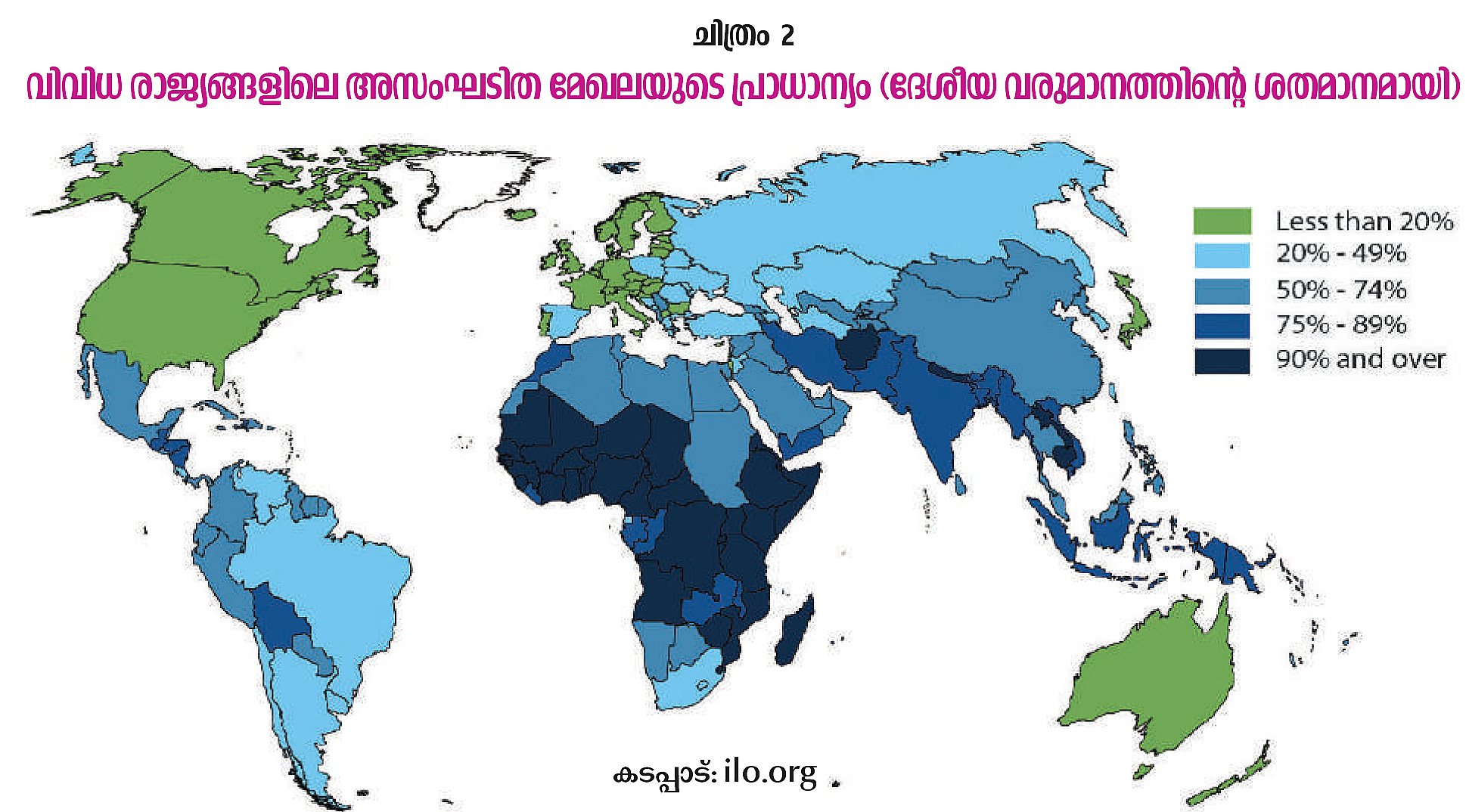 ചിത്രം 2ൽ ആഗോള ഭൂപടത്തിൽ ഓരോ രാജ്യത്തും അസംഘടിത മേഖലയ്ക്ക് ഇന്നുള്ള പ്രാധാന്യം വരച്ചുകാട്ടിയിരിക്കുന്നു. പച്ചനിറത്തിൽ രേഖപ്പെടുത്തിയിട്ടുള്ള അമേരിക്ക, കാനഡ, യൂറോപ്യൻ രാജ്യങ്ങൾ എന്നിവിടങ്ങളിൽ അസംഘടിത മേഖലയിലെ തൊഴിലെടുക്കുന്നവർ മൊത്തം തൊഴിൽസേനയുടെ 20 ശതമാനത്തിൽ താഴെയേ വരൂ.