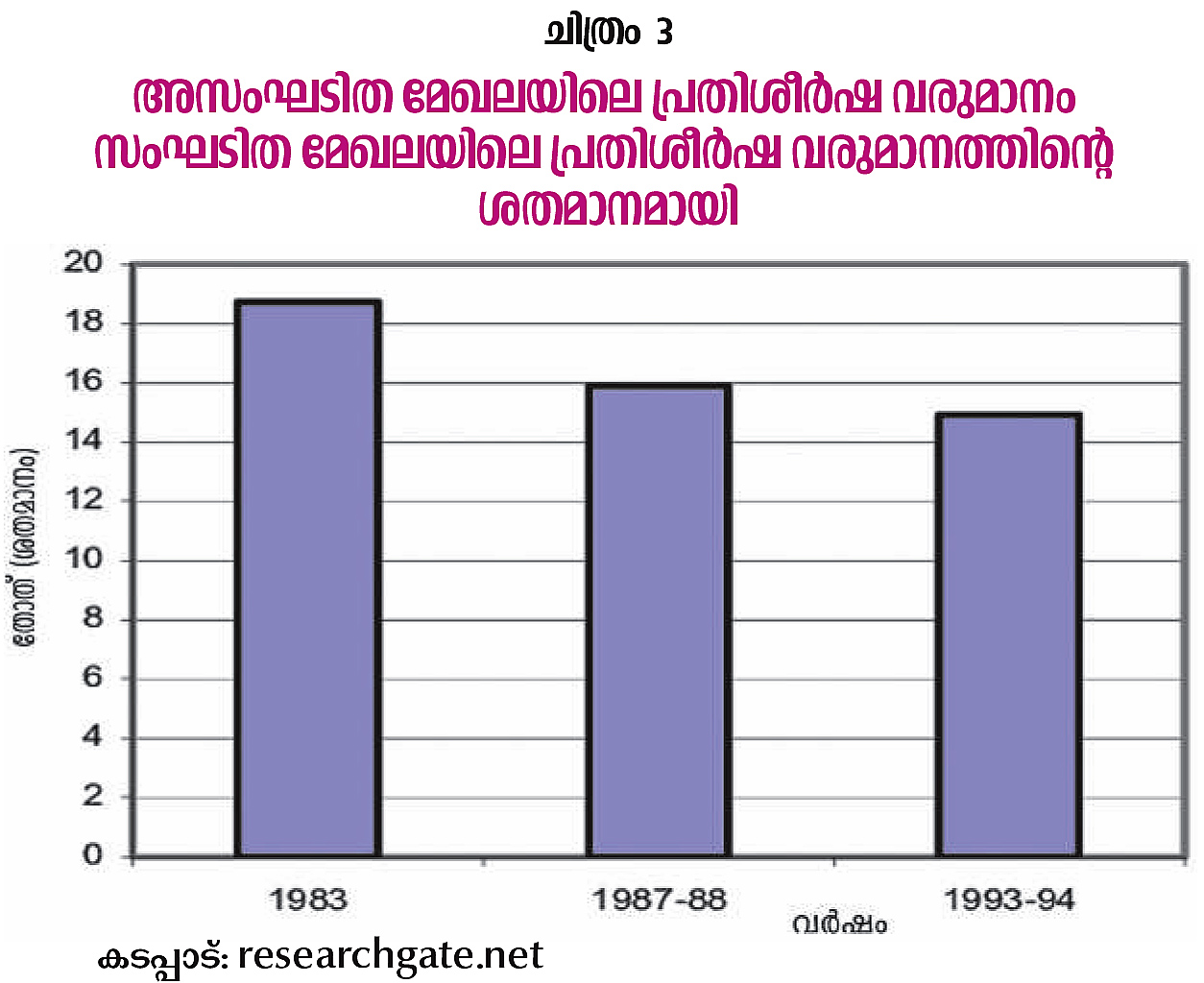 1983ൽ അസംഘടിത മേഖലയിലെ പ്രതിശീർഷ വരുമാനം സംഘടിത മേഖലയിലെ പ്രതിശീർഷ വരുമാനത്തിന്റെ 19 ശതമാനമായിരുന്നു. എന്നാൽ 1993–94 ആയപ്പോഴേക്കും അത് 15 ശതമാനമായി ചുരുങ്ങി. ഇപ്പോഴത് ഏതാണ്ട് 10 ശതമാനം ആയിരിക്കും.