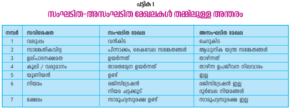 സംഘടിത മേഖലയും അസംഘടിത മേഖലയും തമ്മിലുള്ള പ്രധാന വ്യത്യാസം താഴെ പട്ടിക 1ൽ കൊടുത്തിരിക്കുന്നു.