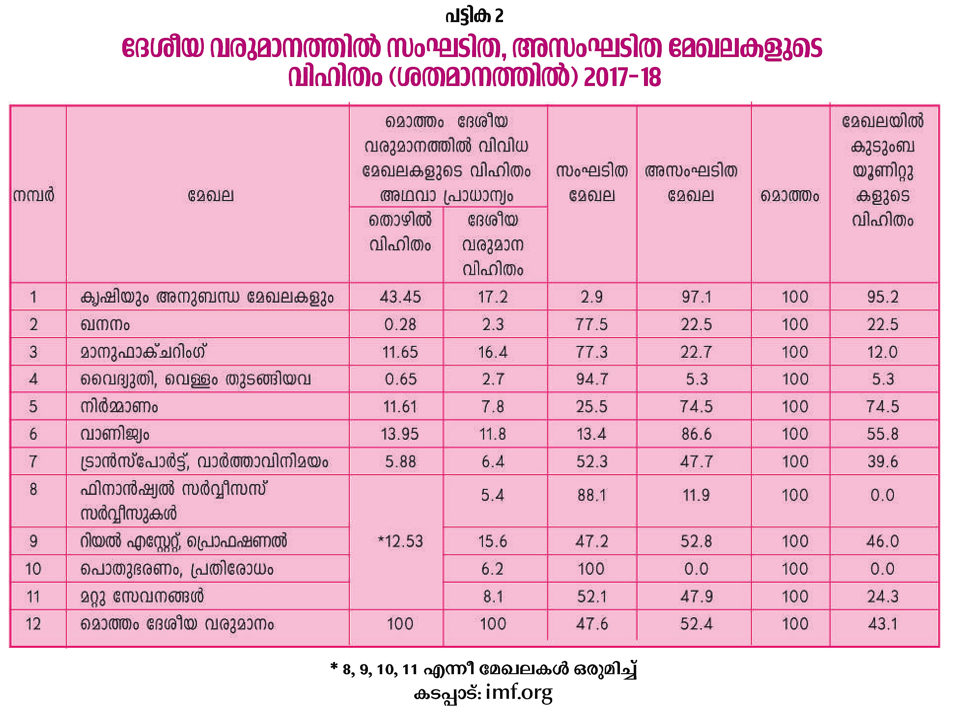പട്ടിക 2ൽ മൂന്നുതരം വിവരങ്ങൾ നൽകിയിരിക്കുന്നു. ഒന്ന്, വിവിധ തൊഴിൽ മേഖലകൾക്ക് (കോളം 2) തൊഴിൽസേനയിലും (കോളം 3) ദേശീയ വരുമാനത്തിലും (കോളം 4) ഉള്ള പ്രാധാന്യം അഥവാ അവയുടെ ശതമാന വിഹിതം നൽകിയിരിക്കുന്നു. രണ്ട്, ഓരോ മേഖലയിലും ദേശീയ വരുമാനത്തിൽ സംഘടിത മേഖല (കോളം 5), അസംഘടിത മേഖല (കോളം 6) എന്നിവയുടെ ശതമാന വിഹിതം നൽകിയിരിക്കുന്നു.