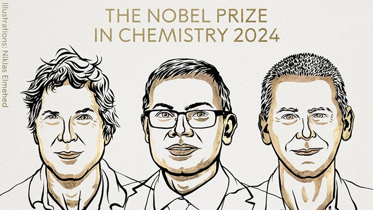 ഈ വർഷത്തെ രസതന്ത്ര നൊബേൽ ഡേവിഡ് ബേക്കർ, ഡെമിസ് ഹസാബിസ്, ജോൺ ജംപർ എന്നീ ശാസ്ത്രജ്ഞർ പങ്കിട്ടു. ജീവശരീരത്തിലെ എല്ലാ രാസപ്രവർത്തനങ്ങളേയും നിയന്ത്രിക്കുന്ന തന്മാത്രകളാണ് പ്രോട്ടീനുകൾ. സാധാരണയായി പ്രോട്ടീനുകളിൽ കാണുന്ന 20 അമിനോ ആസിഡുകളെ ഉപയോഗിച്ച് ജീവശരീരത്തിൽ കാണപ്പെടാത്ത പുതിയ പ്രോട്ടീനുകൾ നിർമ്മിച്ചതാണ് യൂണിവേഴ്സിറ്റി ഓഫ് വാഷിംഗ്ടണിലെ പ്രൊഫസറായ ഡേവിഡ് ബേക്കറിനെ പുരസ്കാരത്തിന് അർഹനാക്കിയത്. മരുന്നുകൾ, വാക്സിനുകൾ, സെൻസറുകൾ തുടങ്ങി പല മേഖലകളിൽ ഈ പുതിയ പ്രോട്ടീനുകൾ ഉപയോഗിക്കാനാവും. ഇന്നുവരെ കണ്ടെത്തിയ ഇരുന്നൂറ് ദശലക്ഷം പ്രോട്ടീനുകളുടെ ഘടന കണ്ടെത്താൻ സഹായിക്കുന്ന AlphaFold2 എന്ന എ ഐ ടൂൾ വികസിപ്പിച്ചതിനും, പ്രോട്ടീനുകളുടെ ഘടന പ്രവചിച്ചതിനുമാണ് ഗൂഗിൾ ഡീപ് മൈൻറ്ന്റെ സി എ ഓ ആയ ഡെമിസ് ഹസാബിസിനും അതേ സ്ഥാപനത്തിലെ മുതിർന്ന ഗവേഷകനായ ജോൺ ജംപറിനും നോബൽ നല്കപ്പെടുന്നത്. ഇന്ന് 20 ലക്ഷത്തിലേറെ ഗവേഷകർ ഇവർ വികസിപ്പിച്ച ടൂൾ ഉപയോഗിക്കുന്നുണ്ട്. പ്രോട്ടീനുകളുടെ പ്രവർത്തനം മനസ്സിലാക്കാനും , പ്രത്യേക ദൌത്യങ്ങൾ നിർവ്വഹിക്കുന്ന പുതിയ പ്രോട്ടീൻ ഘടനകൾ വികസിപ്പിക്കാനും ഇവരുടെ കണ്ടെത്തൽ സഹായിക്കുന്നു.