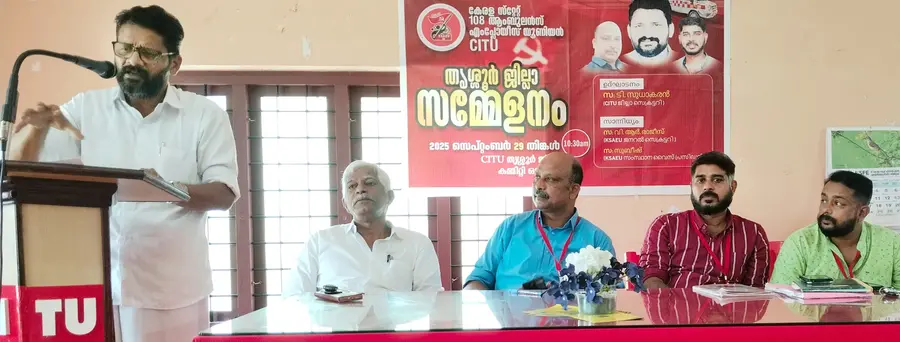 കേരള സ്റ്റേറ്റ് 108 ആംബുലൻസ് എംപ്ലോയീസ് യൂണിയൻ (സിഐടിയു) ജില്ലാ സമ്മേളനം സിഐടിയു ജില്ലാ സെക്രട്ടറി ടി സുധാകരൻ ഉദ്ഘാടനം ചെയ്യുന്നു