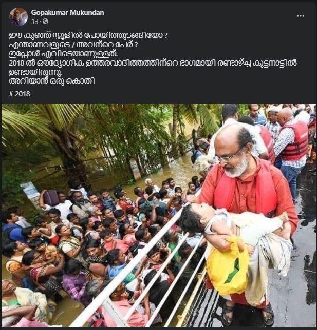 കൊച്ചി> ജൂഡ് ആന്തണി ജോസഫിന്റെ '2018' റെക്കോർഡ് കളക്ഷനുമായി മുന്നേറുമ്പോൾ മഹാപ്രളയത്തിലെ കേരളത്തിന്റെ അതിജീവനകഥ വീണ്ടും ചർച്ചയാവുകയാണ്. പ്രളയകാലത്തെ ഓർമ്മകളിലൊന്നാണ് കുട്ടനാട്ടിലെ രക്ഷാപ്രവർത്തനത്തിനിടെ മന്ത്രിയായിരുന്ന തോമസ് ഐസക് പിഞ്ചുകുഞ്ഞിനെ നൊഞ്ചോട് ചേര്ത്തു പിടിച്ചിരിക്കുന്ന ചിത്രം. ആ കുഞ്ഞിനെ തേടിയുള്ള തോമസ് ഐസകിന്റെ മുൻ സ്റ്റാഫും ഗവേഷകനുമായ ഗോപകുമാർ മുകുന്ദന്റെ അന്വേഷണം അവസാനം കുട്ടനാട്ടിലെ ജൊഹാനിലെത്തി.
