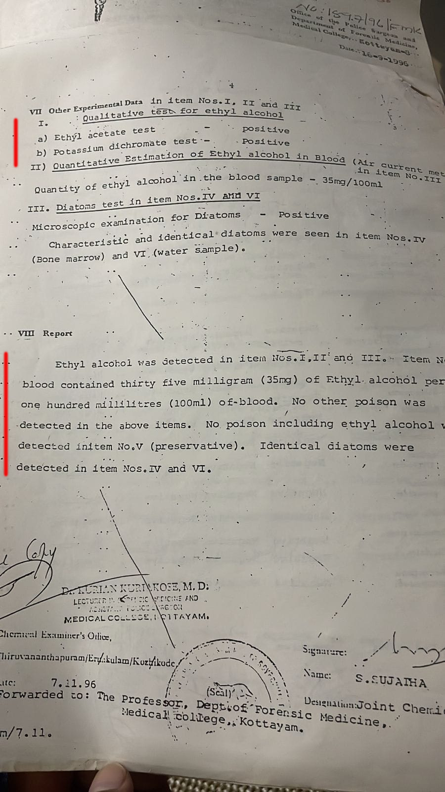 ഇതാ മദ്യപിച്ചതിന്റെ തെളിവുള്ള കെമിക്കൽ അനലിസിസ് റിപ്പോർട്ട് ...