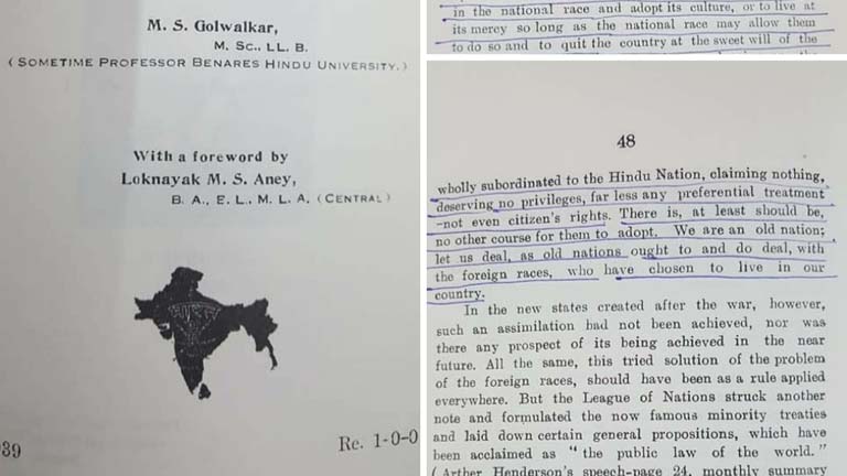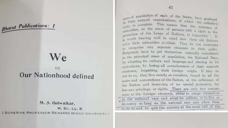 ചിത്രത്തിലുള്ളത് 1939 ൽ പ്രസിദ്ധീകരിച്ച ഗോൾവാൾക്കറുടെ (വി ഓർ ഔർ നാഷൻഹുഡ്)പുസ്തകവും അതിലെ പേജ് 47 ഉം 48 ഉം. പുസ്തകത്തിന്റെ പേര് ' നാം അഥവാ നമ്മുടെ രാഷ്ട്രം നിർവ്വചിക്കപ്പെടുന്നു.' ഗോൾവാൾക്കർ അന്ന് നിർവ്വചിച്ച ഹിന്ദു രാഷ്ട്രത്തിന്റെ പ്രമാണമാണ് ഈ രാത്രിയിലെ ഇരുളിൽ പാസ്സാക്കിയ പൗരത്വ നിയമം. മതനിരപേക്ഷ ഭരണഘടനയെ പിച്ചിച്ചീന്തി, മതം പൗരത്വത്തിന്റെ അടിസ്ഥാനമാക്കുന്ന ഈ നിയമത്തിന്റെ വേര് ഗോൾവാൾക്കറുടെ ഈ പുസ്തകത്തിലാണ്.