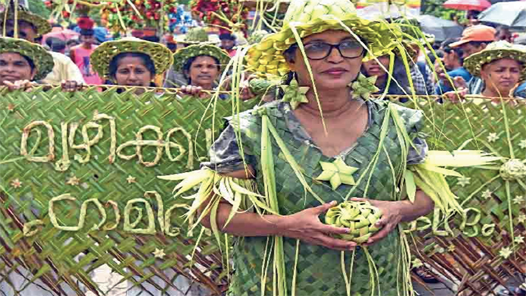 തെങ്ങോലയിൽ നെയ്ത വസ്ത്രം ഉൾപ്പെടെ വിവിധങ്ങളായ ഉൽപ്പന്നങ്ങൾ അണിഞ്ഞെത്തിയവർ കാണികളുടെ ശ്രദ്ധാകേന്ദ്രമായി. മൂഴിക്കുളം ഗ്രാമീണ കലാകേന്ദ്രം പ്രവർത്തകരാണ് ഓലയിൽ തീർത്ത വസ്തുക്കളുമായി വേറിട്ടുനിന്നത്. മുൻനിരയിൽ പിടിക്കാനുള്ള ബാനർ, ബാനറിലെ എഴുത്ത്, വസ്ത്രം, തൊപ്പികൾ, കളിപ്പാട്ടങ്ങൾ, ഓലപ്പീപ്പി തുടങ്ങിയവ പ്രദർശിപ്പിച്ചാണ് ടി ആർ പ്രേംകുമാറും സംഘവും ഘോഷയാത്രയിൽ അണിനിരന്നത്.