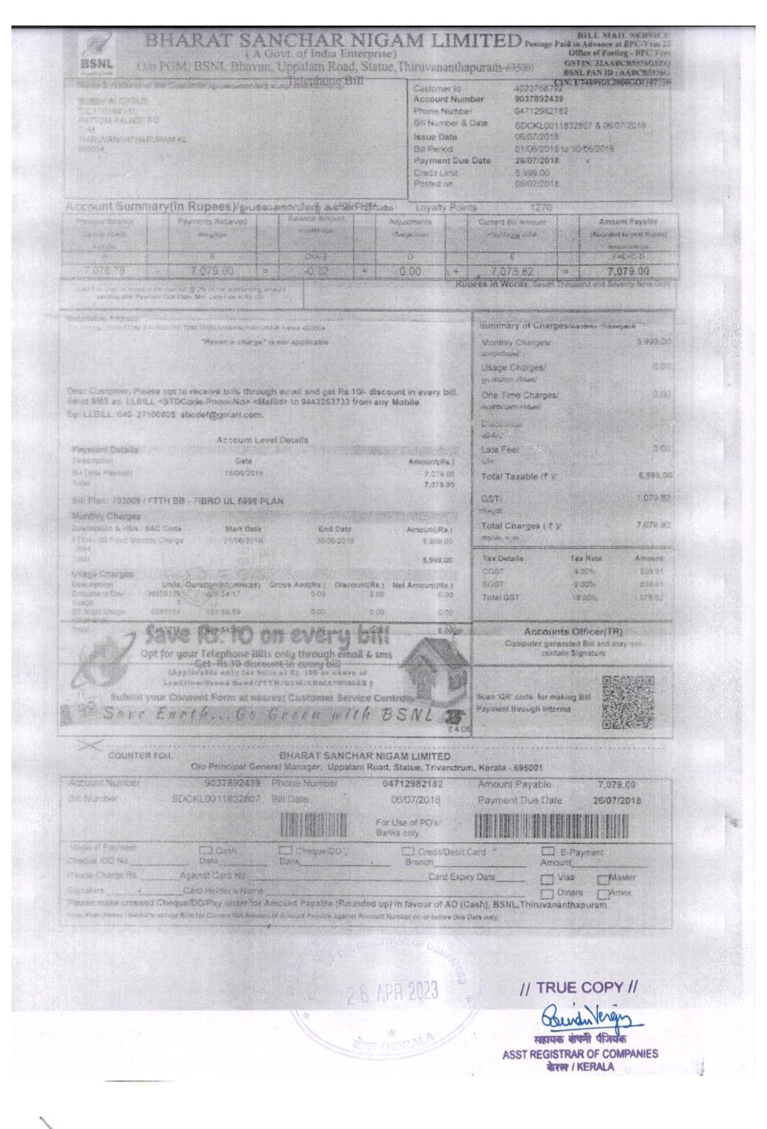 Ext.A1,അതായത്,മുകളിൽ കൊടുത്തിരിക്കുന്ന ബില്ലിന്റെ അറ്റസ്റ്റഡ് കോപ്പി Forged Document ആണെന്ന് കൃത്യമായി മറുപടി കിട്ടിയിരിക്കുന്നു. പോരേ ഷാജൻ സാറേ.. ഒരു സർക്കാർ സ്ഥാപനത്തിന്റെ പേരിൽ വ്യാജ രേഖ നിർമ്മിക്കുക.അത് മറ്റൊരാവശ്യത്തിനായി ഉപയോഗിക്കുക.ചെറിയ പരിപാടിയല്ലല്ലൊ ഇതൊന്നും.തങ്ങളുടെ പേരിൽ,വ്യാജരേഖ ചമച്ചതിന് ബി.എസ്.എൻ.എല്ലിന് നിയമനടപടികൾ സ്വീകരിക്കാം.വ്യാജ രേഖ സമർപ്പിച്ചതിന്റെ പേരിൽ രജിസ്ട്രാർ ഓഫ് കമ്പനീസിന് നിയമനടപടികൾ സ്വീകരിക്കാം.