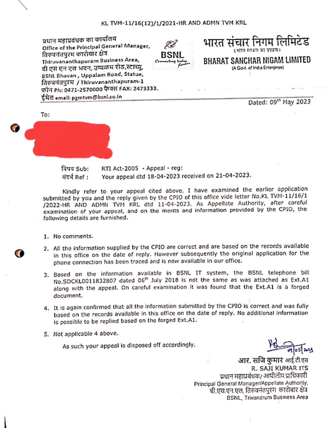 ബിൽ നമ്പർ:SDCKL0011832807 ഈ ബില്ലിന്റെ കോപ്പി വച്ച് ഒരു സുഹൃത്ത്,വിവരാവകാശ നിയമപ്രകാരം ഈ ബില്ലിന്റെ ആധികാരികത സംബന്ധിച്ച് BSNL പ്രിൻസിപ്പൽ ജനറൽ മാനേജർക്ക്(തിരുവനന്തപുരം) ഒരു RTI അപേക്ഷ നൽകിയിരുന്നു.ആദ്യത്തെ ചിത്രത്തിലുള്ള ബില്ലിന്റെ അറ്റസ്റ്റഡ് കോപ്പിയും ഒപ്പം ചേർത്തിരുന്നു.അതിന്റെ ആധികാരികത സംബന്ധിച്ചും അപേക്ഷയിൽ ചോദ്യം ചോദിച്ചിരുന്നു.