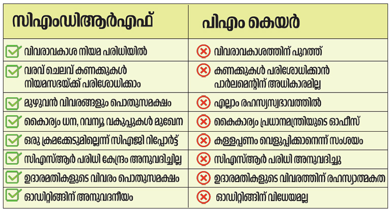 പിഎം കെയറിനെക്കുറിച്ചുള്ള വിവരങ്ങൾ ദുരൂഹമാക്കുന്നതിന് മറുപടി പറയാൻ ബാധ്യതയില്ലെന്ന നിലപാടാണ് കേന്ദ്രത്തിന്റേത്. പൊതുമേഖലാ സ്ഥാപനങ്ങളുടെ സാമൂഹ്യ ഉത്തരവാദിത്ത ഫണ്ടിൽനിന്ന് കോടികളാണ് പിഎം കെയറിലേക്ക് സംഭാവന ചെയ്യിച്ചത്. സംഭാവനകളുടെ സ്രോതസും ധനസഹായവുമടക്കം എല്ലാവിവരവും പാർലമെന്റിൽ വയ്ക്കുക, ചട്ടവും നിയമവുമനുസരിച്ച് ഓഡിറ്റിങ് നടത്തുക, സംഭാവന നൽകുന്നവരുടെ വിവരവും ഫണ്ടിൽനിന്നുള്ള സഹായവും തെരഞ്ഞെടുപ്പ് മാനദണ്ഡവും പരസ്യപ്പെടുത്തുക തുടങ്ങിയ ആവശ്യങ്ങളൊന്നും പരിഗണിക്കപ്പെട്ടില്ല.പ്രധാനമന്ത്രിയുടെ ദുരിതാശ്വാസനിധിയിലേക്കും പിഎം കെയർ ഫണ്ടിലേക്കുമുള്ള സംഭാവനകൾ സിഎസ്ആർ പരിധിയിൽ കൊണ്ടുവന്ന കേന്ദ്രം, സമാന ആനുകൂല്യം മുഖ്യമന്ത്രിമാരുടെ ദുരിതാശ്വാസനിധിക്ക് അനുവദിക്കുന്നില്ല. പ്രധാനമന്ത്രിയുടെ ദുരിതാശ്വാസ നിധി നിലവിലുള്ളപ്പോൾ വേറെ ഫണ്ട് രൂപീകരിക്കുന്നത് വിവാദമായിരുന്നു. വിവരാവകാശ നിയമപ്രകാരംപോലും കേന്ദ്രം മറുപടി നൽകുന്നില്ല.