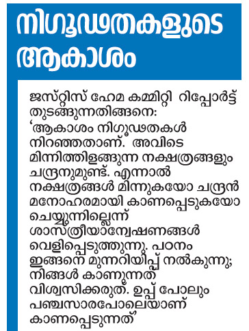 ● നടിമാർക്കെതിരെ നടക്കുന്ന ലൈംഗിക ചൂഷണങ്ങളും ഉപദ്രവങ്ങളും കമ്മിറ്റിയെ ഞെട്ടിച്ചു