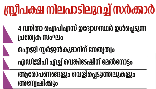 ജസ്റ്റിസ് ഹേമ കമ്മിറ്റി റിപ്പോർട്ടിനുപിന്നാലെ ഉയർന്ന വെളിപ്പെടുത്തലും ആരോപണങ്ങളും അന്വേഷിക്കാൻ സംസ്ഥാന സർക്കാർ പ്രത്യേക പൊലീസ് സംഘത്തെ നിയോഗിച്ചു. നിയമോപദേശത്തിന്റെ അടിസ്ഥാനത്തിൽ മുഖ്യമന്ത്രി പിണറായി വിജയൻ വിളിച്ചുചേർത്ത ഉന്നത പൊലീസ് ഉദ്യോഗസ്ഥരുടെ യോഗത്തിലാണ് തീരുമാനം. ഐജി സ്പർജൻ കുമാറിന്റെ നേതൃത്വത്തിൽ ഉയർന്ന റാങ്കിലുള്ള വനിതാ പൊലീസ് ഉദ്യോഗസ്ഥർ ഉൾപ്പെടുന്നതാണ് സംഘം. ക്രൈംബ്രാഞ്ച് എഡിജിപി എച്ച് വെങ്കിടേഷ് മേൽനോട്ടം വഹിക്കും.