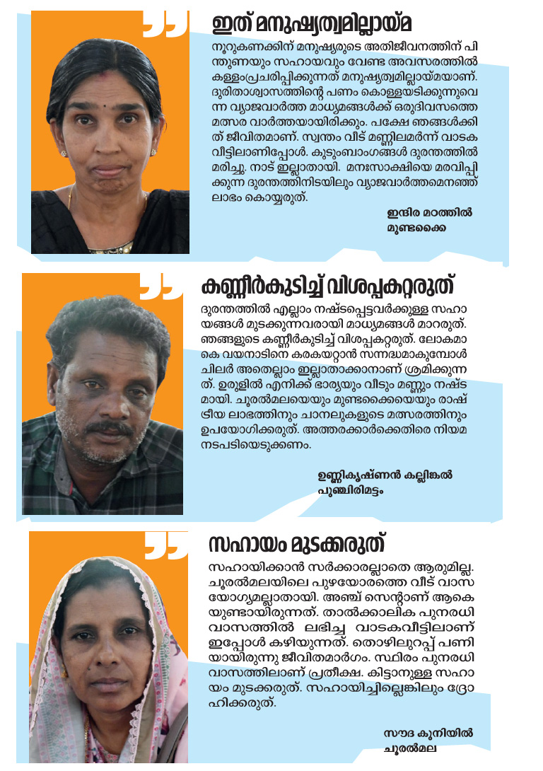 വയനാടെന്ന കണ്ണീർമുറിവിൽ മുളകുപുരട്ടുന്നവർ മനുഷ്യരാണോ? കേരളത്തെ അടിക്കാൻ നിൽക്കുന്ന കേന്ദ്രത്തിന് വടി നൽകുന്നവർ മലയാളികളാണോ? എസ്റ്റിമേറ്റിനെ എക്സ്പെൻഡിച്ചറാക്കി കള്ളകഥ പിന്തുടർന്നവർ തലയിൽ മുണ്ടിട്ട് ഓടിയിട്ടും ചിലരാ മാലിന്യത്തിൽ മുങ്ങിത്തപ്പുകയാണ് ഇപ്പോഴും. കേരളത്തിന് അർഹമായതൊന്നും കേന്ദ്രം നൽകാതിരിക്കുമ്പോൾ ചെറുവിരലനക്കാത്തവരാണ് ഇവർ. ദുരന്തത്തെയും തോൽപ്പിക്കുന്ന ഈ ദുരന്തങ്ങളെ മാധ്യമവേട്ടക്കാരെന്ന് ചരിത്രം വിലയിരുത്തും