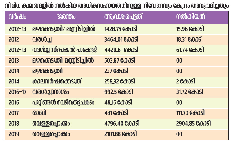 വിവിധ പ്രകൃതിദുരന്തങ്ങളിൽ സംസ്ഥാന ദുരന്ത നിവരാണ അതോറിറ്റി വഴി സർക്കാർ തയ്യാറാക്കിനൽകുന്ന നഷ്ടപരിഹാരക്കണക്കിൽ അതിന്റെ പകുതി പോലും ലഭിക്കാറില്ല. 2019ലെ വെള്ളപ്പൊക്കത്തെത്തുടർന്ന് മാനദണ്പ്രകാരം 2101.88 കോടി ആവശ്യപ്പെട്ട് നിവേദനം നൽകിയെങ്കിലും കേന്ദ്രം സഹായിച്ചില്ല. വയനാട് ദുരന്തത്തിന് 50 ദിവസം പിന്നിട്ടിട്ടും ധനസഹായം അനുവദിക്കുമെന്നു പറഞ്ഞതല്ലാതെ നടപടിയുണ്ടായിട്ടുമില്ല. ഇതിനുവേണ്ടി സമർപ്പിച്ച നിവേദനത്തെയാണ് വിവാദമാക്കി സഹായം ലഭിക്കുന്നത് ഇല്ലാതാക്കാനുള്ള മാധ്യമ നീക്കവും.