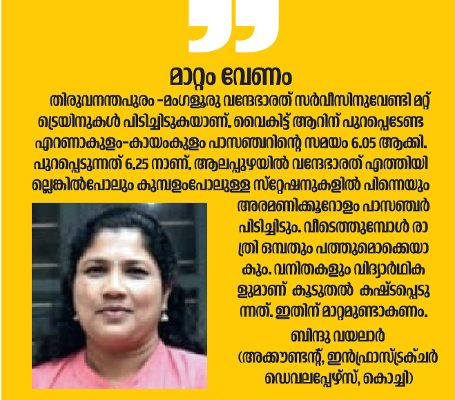 ആലപ്പുഴ വഴിയുള്ള വന്ദേഭാരത് എക്സ്പ്രസ് ഓടിത്തുടങ്ങിയിട്ട് ഒരുവർഷം തികയുമ്പോൾ വ്യാപകമായ പരാതി. മറ്റ് ട്രെയിൻ യാത്രക്കാരെ ദുരിതത്തിലാക്കിയാണ് വന്ദേഭാരതിന്റെ യാത്രയെന്നാണ് പരാതി. വൈകിട്ട് 4.05ന് തിരുവനന്തപുരം സെൻട്രലിൽനിന്ന് യാത്രയാകുന്ന തിരുവനന്തപുരം–- മംഗളൂരു വന്ദേഭാരത് വൈകിട്ട് ആറിന് പുറപ്പെടുന്ന എറണാകുളം–-കായംകുളം പാസഞ്ചർ യാത്രക്കാരെയാണ് ഏറെ പ്രയാസത്തിലാക്കുന്നത്. വന്ദേഭാരതിന് കടന്നുപോകാനായി പാസഞ്ചർ ട്രെയിൻ പലസ്ഥങ്ങളിലായി ഒരുമണിക്കൂറിലേറെയാണ് പിടിച്ചിടുന്നത്. പരിഹാരം ആവശ്യപ്പെട്ട് യാത്രക്കാർ പ്രക്ഷോഭത്തിന് ഒരുങ്ങുകയാണ്.