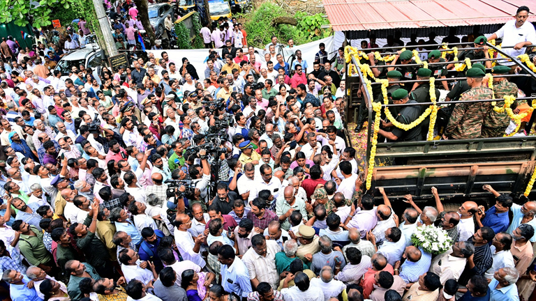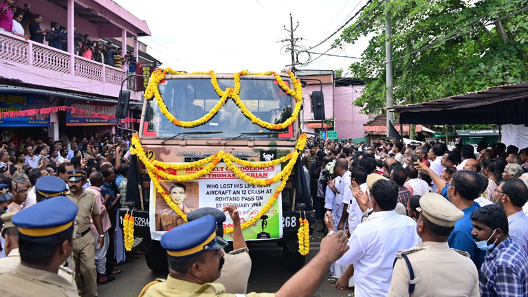 പത്തനംതിട്ട> 1968-ൽ ലേ ലഡാക്കിൽ വിമാന അപകടത്തിൽ വീരമൃത്യു വരിച്ച സൈനികൻ തോമസ് ചെറിയാന് ജന്മനാട് വിടനൽകി. വെള്ളിയാഴ്ച രാവിലെ പത്തരയോടെ ജന്മനാടായ പത്തനംതിട്ട ഇലന്തൂരിൽ എത്തിച്ച മൃതദേഹം വൈകുന്നേരം പൂർണ സൈനിക ബഹുമതികളോടെ ഇലന്തൂർ കാരൂർ സെന്റ് പീറ്റേഴ്സ് പള്ളി സെമിത്തേരിയിൽ സംസ്കരിച്ചു.