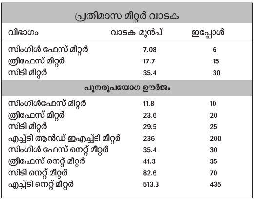 സംസ്ഥാനത്ത് 1,26,87,037 സിംഗിൾ ഫേസ് ഉപയോക്താക്കളും 12,74,456 ത്രീഫേസ് ഉപയോക്താക്കളുമാണുള്ളത്. ത്രീ ഫെയ്സ് കണക്ഷന് മീറ്റർ വാടകയായി 30 രൂപ നൽകുന്നവർ കേന്ദ്ര–-സംസ്ഥാന ജിഎസ്ടി വിഹിതമായി 5.40 രൂപ അധികമായി നൽകണമായിരുന്നു. ഇനിമുതൽ ബില്ലിൽ 5.40 രൂപ കുറയും. ആറുരൂപ മുതൽ 1000 രൂപവരെ മീറ്റർ വാടകയുള്ള പുനരുപയോഗ ഊർജ ഉപയോക്താക്കൾ ഉൾപ്പടെ വിവിധ വിഭാഗം ഉപഭോക്താക്കൾക്കും തുക ഇളവുണ്ടാകും.