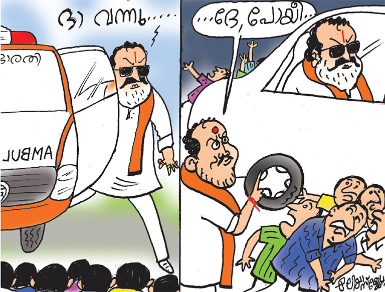 ചേലക്കരയിലെ തെരഞ്ഞെടുപ്പ് കൺവൻഷനെത്തിയ കേന്ദ്രമന്ത്രി സുരേഷ് ഗോപി തട്ടിവിട്ട ‘പൂരക്കള്ള’ത്തിൽ നാണംകെട്ട് ബിജെപി. തൃശൂർ പൂരത്തിന് താൻ ആംബുലൻസിലല്ല ജില്ലാ പ്രസിഡന്റിന്റെ കാറിലാണ് എത്തിയതെന്നാണ് സുരേഷ്ഗോപി തിങ്കളാഴ്ച പറഞ്ഞത്. എന്നാൽ, ബിജെപി ജില്ലാ പ്രസിഡന്റ് കെ കെ അനീഷ്കുമാർ ഇതു തള്ളി. കാറിലാണ് ആദ്യം വന്നതെങ്കിലും നഗരപരിധിയിൽ പൊലീസ് തടഞ്ഞപ്പോൾ സേവാഭാരതിയുടെ ആംബുലൻസ് വരുത്തി അതിലാണ് പൂര സ്ഥലത്ത് എത്തിയതെന്ന് വെളിപ്പെടുത്തി.