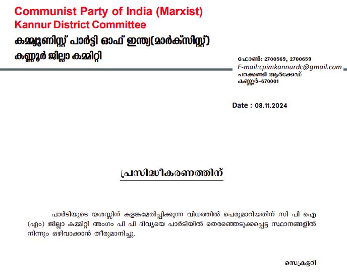 എഡിഎം നവീൻ ബാബുവിന്റെ മരണം: പി പി ദിവ്യയ്ക്കെതിരെ പാർടി നടപടി