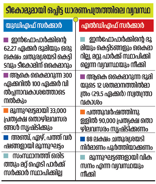 100 ഏക്കർ പാട്ടഭൂമിയും 136 ഏക്കർ അധികഭൂമിയും 38 കോടി രൂപയ്ക്ക് വിൽക്കാനുമായിരുന്നു യുഡിഎഫ് കരാർ. എൽഡിഎഫ് സർക്കാർ വിൽപ്പന ഒഴിവാക്കിയെന്നു മാത്രമല്ല, മുഴുവൻ ഭൂമിയും പാട്ടത്തിനാക്കി. ഇൻഫോ പാർക്ക് 109 കോടി രൂപയ്ക്ക് ടീകോമിന് വിൽക്കുന്നതിനും അതിന്റെ ബ്രാൻഡ് നെയിം ടീകോമിന് നൽകുന്നതിനും നിശ്ചയിച്ചിരുന്നുവെന്നതും പ്രതിപക്ഷം മറച്ചുവയ്ക്കുന്നു. എന്നാൽ എൽഡിഎഫ് സർക്കാർ ഇൻഫോപാർക്ക് വിട്ടുനൽകിയില്ല. യുഡിഎഫ് മാധ്യമങ്ങളൊഴികെയുള്ളവരും വിദഗ്ധരും പറയുന്നതും ഭൂമി ഏറ്റെടുത്ത് വികസന സാധ്യത പരമാവധി പ്രയോജനപ്പെടുത്തണം എന്നാണ്.