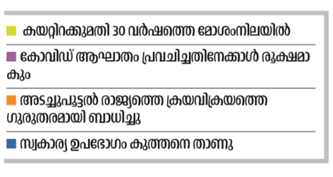 രണ്ടുമാസത്തെ അടച്ചുപൂട്ടൽ രാജ്യത്തെ ക്രയവിക്രയത്തെ ഗുരുതരമായി ബാധിച്ചു. വ്യവസായ ഉൽപ്പാദനത്തിന്റെ 60 ശതമാനം സംഭാവന നൽകുന്ന ആറ് സംസ്ഥാനത്ത് രോഗവ്യാപനം തീവ്രം. സാമ്പത്തിക വര്ഷത്തിന്റെ രണ്ടാംപാതിയില് സ്ഥിതി മെച്ചപ്പെട്ടേക്കാം. മാർച്ചുമുതൽ ഗ്രാമ–-നഗരങ്ങളിൽ വാങ്ങൽശേഷി ഇടിഞ്ഞു. മൂലധന ചരക്കുകളുടെ ഉൽപ്പാദനം മാർച്ചിൽ 36 ശതമാനവും മൂലധന ചരക്കിറക്കുമതി മാർച്ചിൽ 27 ശതമാനവും ഏപ്രിലിൽ 57.5 ശതമാനവും ഇടിഞ്ഞു. ഉരുക്ക് ഉപയോഗം ഏപ്രിലിൽ 91 ശതമാനം കുറഞ്ഞു. സിമന്റ് ഉൽപ്പാദനത്തിൽ മാർച്ചിലെ ഇടിവ് 25 ശതമാനം.