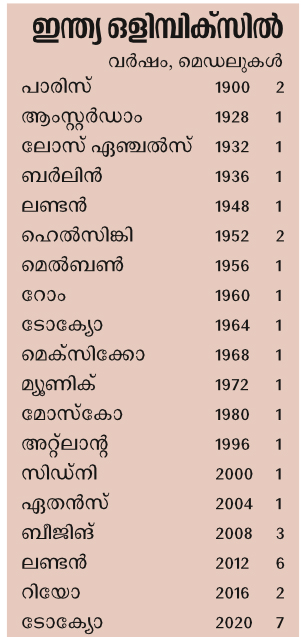 ഒളിമ്പിക്സിന്റെ 32 പതിപ്പിലുമായി ഇന്ത്യയ്ക്ക് നേടാനായത് 35 മെഡൽ. അതിൽ സ്വർണം പത്ത്. അമേരിക്ക കഴിഞ്ഞ ഒളിമ്പിക്സിൽ മാത്രം 39 സ്വർണം നേടിയെന്നറിയുമ്പോഴാണ് ഇന്ത്യ എവിടെനിൽക്കുന്നുവെന്ന് മനസ്സിലാകുക. ഇത്തവണ 16 ഇനങ്ങളിലായി 117 പേരാണ് ടീമിലുള്ളത്. അത്ലറ്റിക്സിലാണ് വലിയ സംഘം–-29. ഷൂട്ടിങ്ങിൽ 21 പേരുണ്ട്.