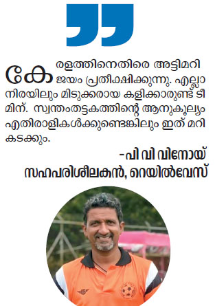 പ്രതിരോധനിരയിൽ രണ്ട് മലയാളികളുണ്ട്. മലപ്പുറത്തുകാരൻ പി കെ ഫസീന് ഇത് അരങ്ങേറ്റമാണ്. തിരുവനന്തപുരത്തുകാരനായ സിജു സ്റ്റീഫന് മൂന്നാം ട്രോഫിയും. മുമ്പ് കേരളത്തിനായി ബൂട്ടിട്ട ജോൺ പോൾ ജോസ് ആക്രമണത്തിന്റെ ചുക്കാൻപിടിക്കും. വിങ്ങറാണ് തിരുവനന്തപുരത്തുകാരൻ. കളത്തിന് പുറത്തും ബലമായി മലയാളികളുണ്ട്. സഹപരിശീലകൻ പി വി വിനോയ് തന്ത്രങ്ങളോതും. തൃശൂരുകാരൻ ആറാംതവണയാണ് റെയിൽവേസിനൊപ്പമെത്തുന്നത്. മുമ്പ് ട്രെയിനറായിരുന്നു. കഴിഞ്ഞ മൂന്ന് വർഷമായി സഹപരിശീലകൻ. ടീമിന്റെ മാനേജർ വി രാജേഷ് പാലക്കാട് സ്വദേശിയാണ്. കേരളം മാത്രമല്ല രാജ്യത്തെ ഫുട്ബോൾ പവർഹൗസുകളായ വടക്കുകിഴക്കൻ സംസ്ഥാനങ്ങളിലെയും ബംഗാൾ, പഞ്ചാബ് തുടങ്ങിയ ഇടങ്ങളിലെയും കളിക്കാർ റെയിൽവേ നിരയിലുണ്ട്.