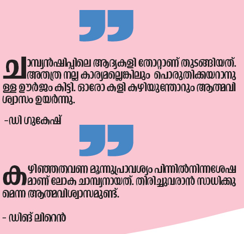 ഇന്നത്തെ കളി ഡിങ്ങിനെ സംബന്ധിച്ച് നിർണായകമാണ്. ഇനിയൊരു തോൽവി കാര്യങ്ങൾ കവിട്ടുപോകാൻ ഇടയാക്കും. വെള്ളക്കരുക്കളുമായാണ് ഇന്നത്തെ കളി. കഴിഞ്ഞതവണ റഷ്യക്കാരൻ ഇയാൻ നിപോംനിഷിക്കെതിരെ മൂന്നുതവണ പിന്നിട്ടുനിന്നശേഷമാണ് കയറിവന്നത്.
