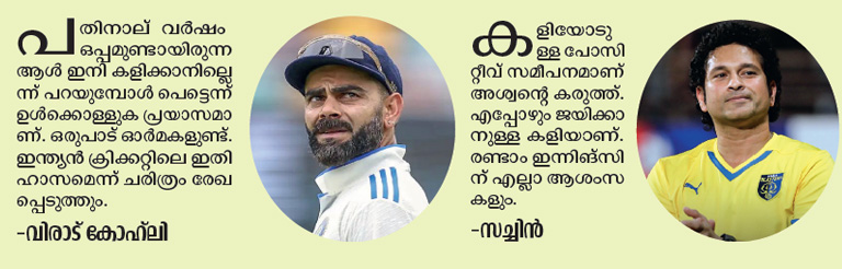 ഗാബയിൽ മഴ കനത്ത് തുടങ്ങുന്ന സമയം. കളിക്കാർ ഓരോരുത്തരായി കളം വിടാനുള്ള ഒരുക്കത്തിലാണ്. ക്യാമറകൾ നേരെ ഇന്ത്യൻ ഡ്രസിങ് റൂമിനുനേരെ തിരിഞ്ഞു. വിരാട് കോഹ്ലിയും ആർ അശ്വിനും സംസാരിച്ചുകൊണ്ടിരിക്കുന്ന ദൃശ്യം. സംസാരത്തിനിടയിൽ കോഹ്ലി അശ്വിനെ പുണർന്നു. സംസാരം തുടരുന്നതിനിടയിൽ അശ്വിൻ കണ്ണൊന്നു തുടച്ചു. കോഹ്ലി കൈകൾ അശ്വിന്റെ തോളിലേക്കിട്ടു. മഴ തകർത്തുപെയ്യാൻ തുടങ്ങി. അശ്വിൻ പടിയിറങ്ങുകയാണ്.
