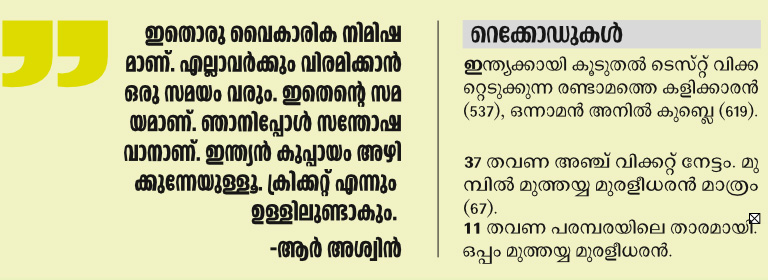 അപ്രതീക്ഷിതമായിരുന്നു പ്രഖ്യാപനം. 106 ടെസ്റ്റിൽ 537 വിക്കറ്റുമായാണ് ‘ക്രിക്കറ്റ് സയന്റിസ്റ്റി’ന്റെ മടക്കം. അനിൽ കുംബ്ലെ കഴിഞ്ഞാൽ ഇന്ത്യയുടെ ഏറ്റവും മികച്ച വിക്കറ്റ് വേട്ടക്കാരൻ. അഞ്ച് വിക്കറ്റ് നേട്ടം 37 തവണ കുറിച്ചിട്ടുണ്ട്. ആറ് സെഞ്ചുറികളും 14 അർധസെഞ്ചുറികളും ഉൾപ്പെടെ 3503 റൺ. 2011ൽ ഏകദിന ലോകകപ്പ് നേടിയ ഇന്ത്യൻ ടീമിന്റെ ഭാഗമായിരുന്നു. ഏകദിനത്തിൽ 156 വിക്കറ്റും ട്വന്റി20യിൽ 72 വിക്കറ്റും നേടി.