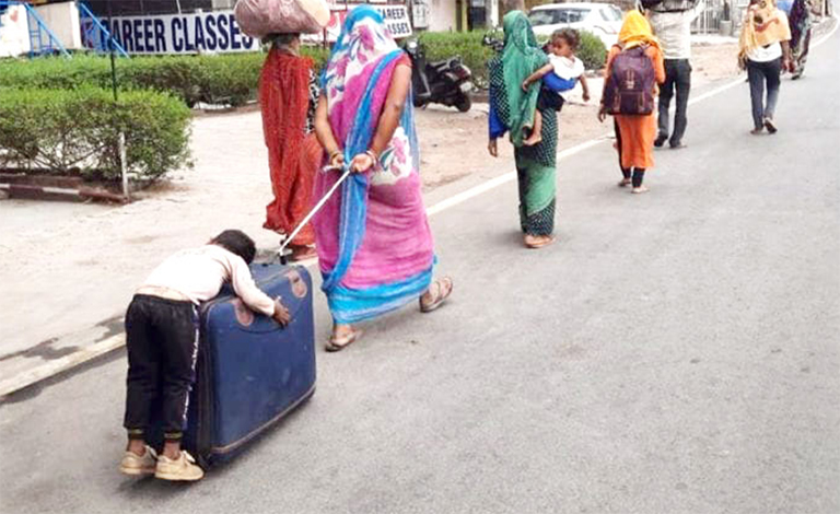 യുപിയിലെ പ്രയാഗ്രാജിൽ നിന്ന് ഗ്രാമത്തിലേക്ക് നടക്കുന്നവർ