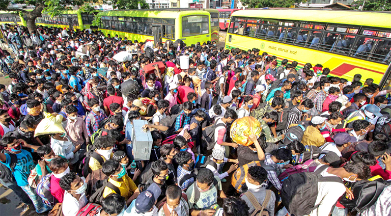 ബംഗളൂരുവിൽനിന്ന് സ്വദേശങ്ങളിലേക്ക് മടങ്ങാൻ തിക്കിത്തിരിക്കി വാഹനം കാത്തുനിൽക്കുന്നവർ