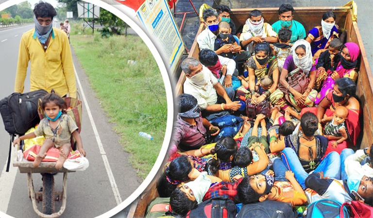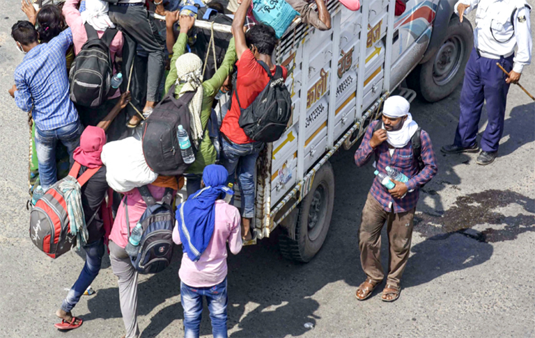 ലോറിയിൽ സ്വദേശത്തേക്കുമടങ്ങുന്ന അതിഥിത്തൊഴിലാളികൾ