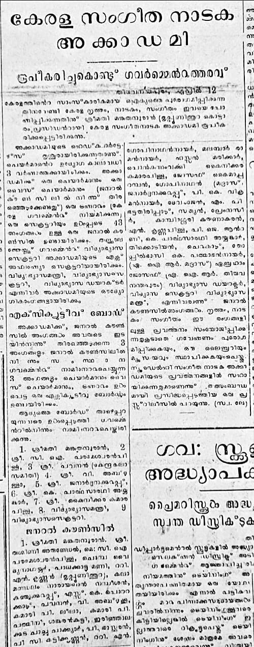 'നിയമസഭയിൽ വിദ്യാഭ്യാസ മന്ത്രി ജോസഫ് മുണ്ടശ്ശേരി സംഗീതനാടക അക്കാദമി രൂപീകരണത്തെപ്പറ്റി സംസാരിക്കുകയായിരുന്നു.