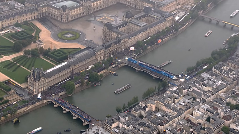 സെൻ നദിയിലൂടെ അത്ലീറ്റുകൾ ആറു കിലോമീറ്ററാണ് സഞ്ചരിച്ചത്. മലിനമായിരുന്ന നദി ഒളിമ്പിക്സിനുവേണ്ടിയാണ് ശുദ്ധിയാക്കിയത്. ഉദ്ഘാടനച്ചടങ്ങ് കൂടാതെ മാരത്തൺ നീന്തലും ഇവിടെയാണ്. മലിനീകരണത്തെ തുടർന്ന് ഒരുനൂറ്റാണ്ടായി നദിയിൽ നീന്തലിന് വിലക്കുണ്ട്. വെള്ളത്തിൽ ഇ കോളി ബാക്ടീരിയയുടെ അളവ് കൂടുതലാണെന്ന് കണ്ടെത്തിയിരുന്നു. ശുദ്ധീകരണത്തിനായി ഏകദേശം 15,000 കോടി രൂപ ചെലവിട്ടെന്നാണ് കണക്ക്.
