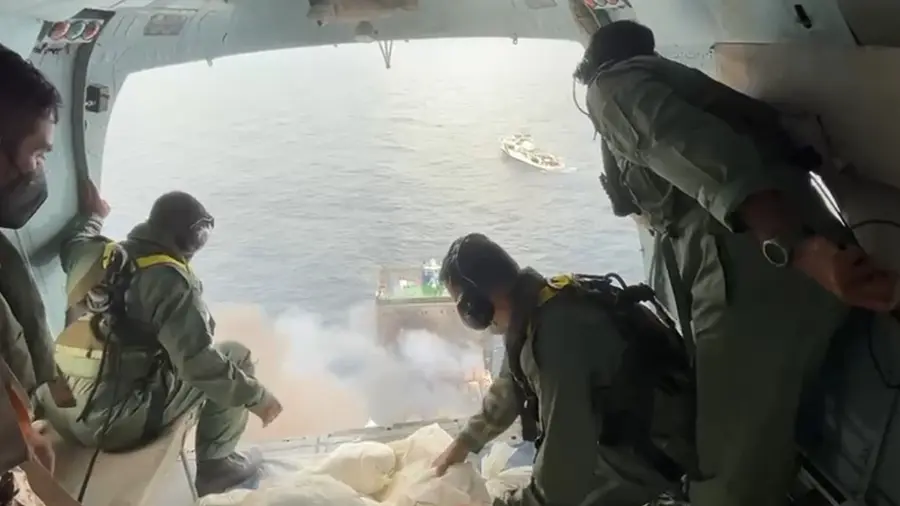 കപ്പലിലെ തീയണയ്ക്കാൻ ആകാശത്തു നിന്നും രാസ പദാർഥങ്ങൾ വിതറി വ്യോമസേന